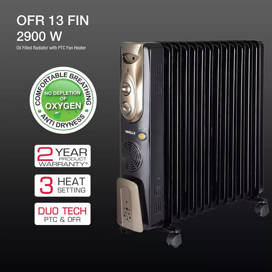 Havells OFR 13 Fin OFR 2900 Watt with 3 Heat Setting DUO Tech PTC & OFR (Black)