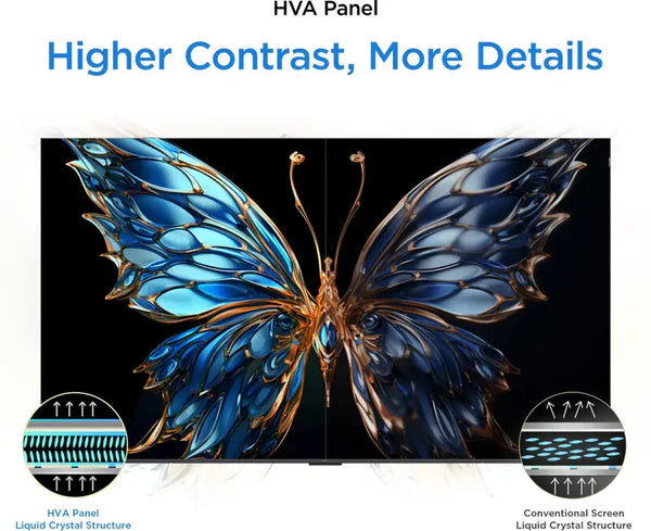 - Display: 4K UHD QLED Panel | HDR 10+ | AiPQ Processor | Dolby Vision Atmos | HVA Panel | 178 Degree Wide Viewing Angle | Micro Dimming | Metallic Bezel-Less Design | MEMC 120 Hz